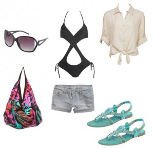 “Shorts and a top” outfit is always welcome, but it is even better when you wear a monokini under a button-down shirt. Here we suggest a contrast – black swimwear, denim shorts and a white shorts. However, it is Summer and you have to look fresh and fun when going to the beach, so we recommend a fun floral bag to add color and excitement and turquoise gladiator sandals.
