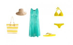 “Color Blocking Combo Outfit” is the perfect choice for playful women who like to flirt with different and to many people not matching colors. A yellow swimwear, preferably bikini, and a lovely blue beach dress! Accessorize this summer look with comfortable yellow flip flops, a striped beach bag and a straw hat.