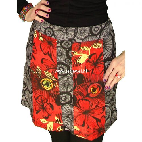 Let’s talk about the colors in skirts. I love this one with bright red patterns painted boldly among black wheeled pattern. You can wear it plain or with black tights – anyway, it will look stunning!