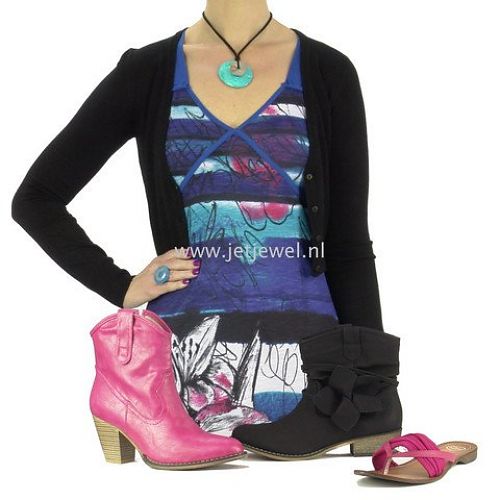 Black is beautiful! And any color combined with it makes it even more beautiful. This black bolero combined with blue, white and red strips, looks pretty cool when paired with a necklace with a superb green pendant, and pink or black shoes, which can be boots or flats.