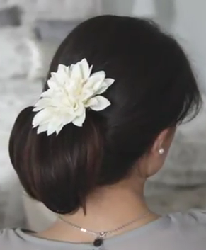 See this simple up-do for example. It is easy to do and can be worn on any casual or formal occasion. You just have to brush your hair first to remove tangles and then make it into a ponytail while further brushing with fingers. Hold the hair at the point of elastic and make two parts, after which hold their ends and form a loop. Flip remaining hair into the loop and pull out the ponytail from the other side, which will give the hair a knot-like look. Tuck any smaller hair in the loop properly, but if it is not caught in, don’t worry, as you can secure it with pins. Now start pinning the hair to get a secure up-do. Use bobby pins of the same color as that of your hair. Use them as many as you want so as to make the bun secure for all day long, because finally we hide them under the flower. After achieving a perfectly secure bun add the flower. Doesn’t it look elegant?