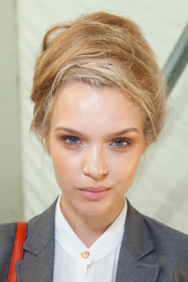 Paul Hanlon wished to create a dry, cloth-like texture to make a turban oriented up-do for the Vera Wang Spring-Summer show 2013, resulting in is this lovely weathered hair look.